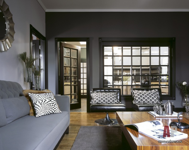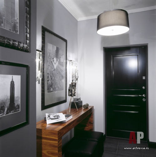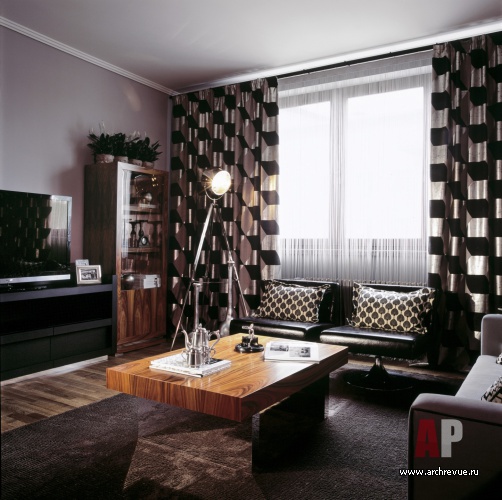 В оформлении квартиры преобладают натуральные отделки и материалы. Однотонные покраски серо-серебристых оттенков с бархатистой фактурой гармонируют с древесиной ореха (на полах) и палисандра (в оформлении мебели).