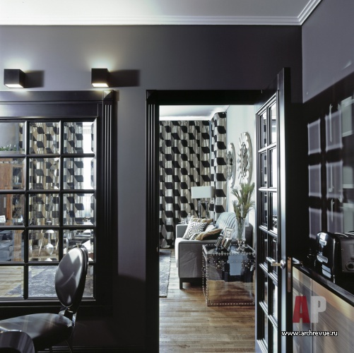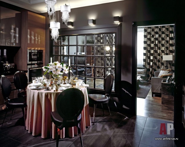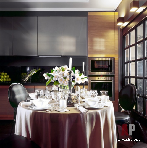 Чтобы разместить необходимое количество функций, авторы проекта частично изменили изначальную планировку квартиры. Так, просторная хозяйская спальня расположилась на месте кухни, а кухня, объединенная со столовой, в свою очередь была вынесена в глубину квартиры. Особенность пространства кухни-столовой – отсутствие окон.