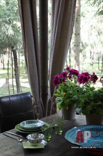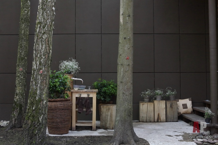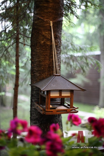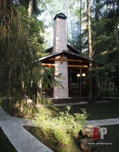 Дом для отдыха расположен среди высоких деревьев. Его оригинальная архитектура – сильно вытянутый по ландшафту прямоугольник, к которому примыкает слегка смещенный по оси квадрат веранды – дань бережному отношению к окружающим деревьям и желанию сохранить как можно большее их количество.