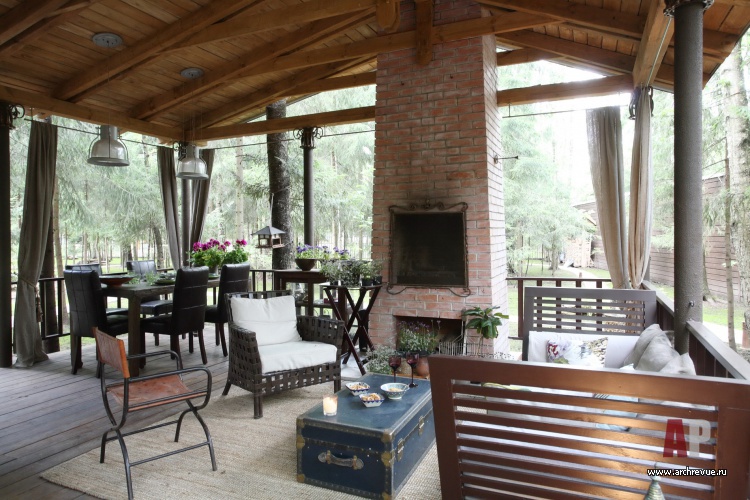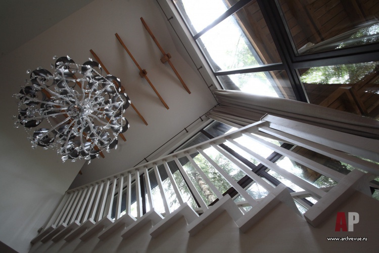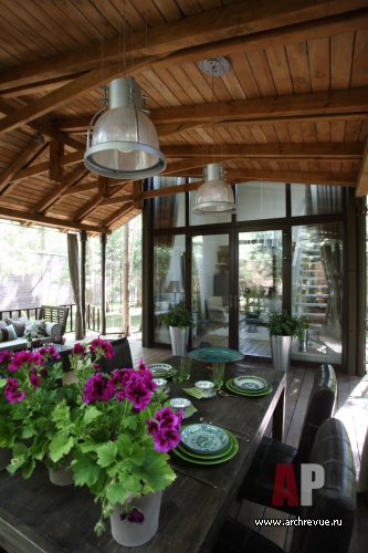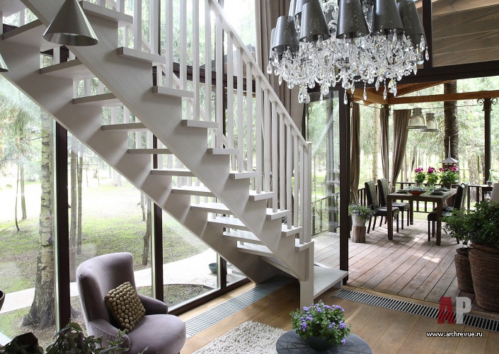 Перед автором проекта стояла задача адаптировать существующую двухэтажную постройку к ландшафту, сделать интерьер продолжением природной среды. Этому служит наличие просторной (30 кв. м) террасы с камином и обеденной зоной, а также панорамное остекление.