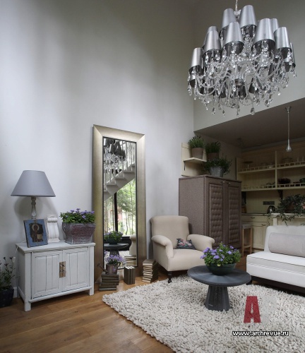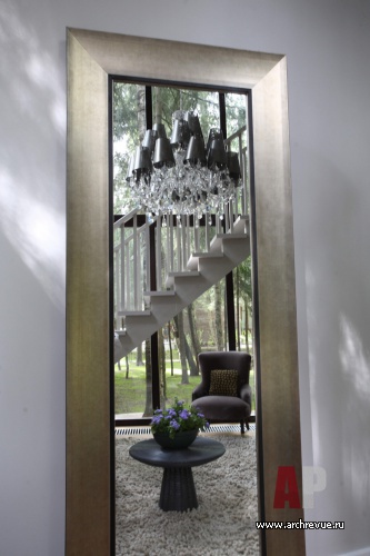 Основной объем гостиной обозначен стеклянными панелями. Благодаря панорамному остеклению двухэтажное пространство выглядит наполненным светом. Большое значение в оформлении дома имеют авторские изделия (от мебели до аксессуаров), которые создают атмосферу отдыха на природе.