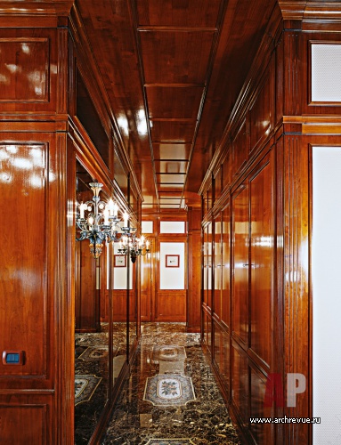 Главный декоративный прием в отделке квартиры – деревянное панелирование. Панелями из ореха зашита большая часть плоскостей входной зоны, а также библиотеки. Баланс света и тени уравновешивают молочные оттенки покраски стен, отполированные поверхности мрамора и стеклянные витражи.