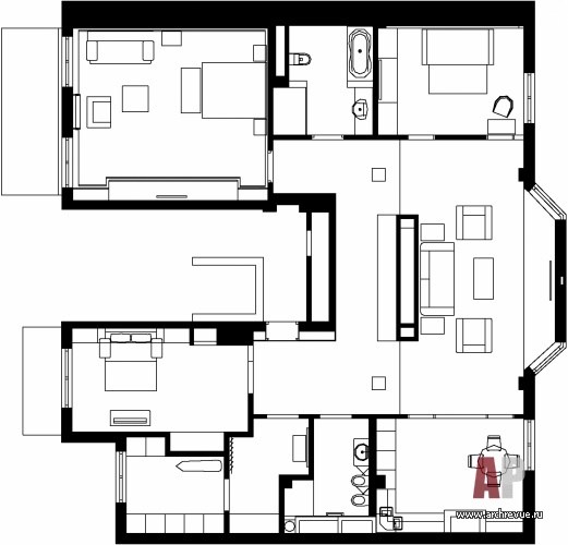 Основное неудобство изначально свободного пространства – стояк посреди квартиры. В ходе перепланировки авторы проекта убрали его в шкаф, ставший частью широкого коридора-галереи.