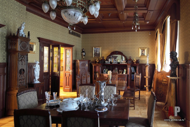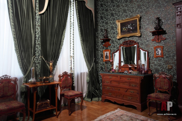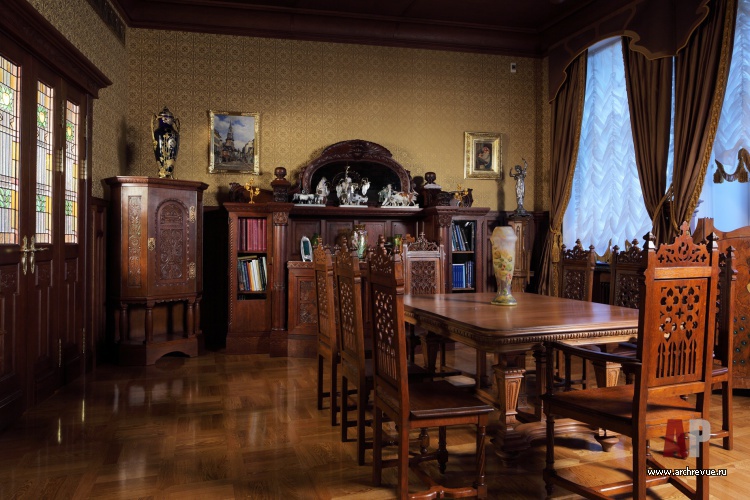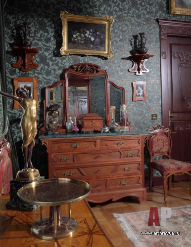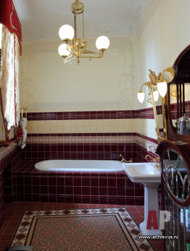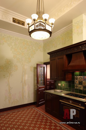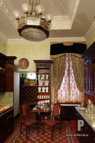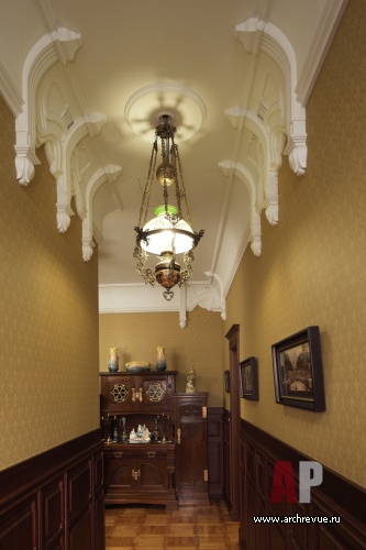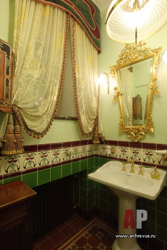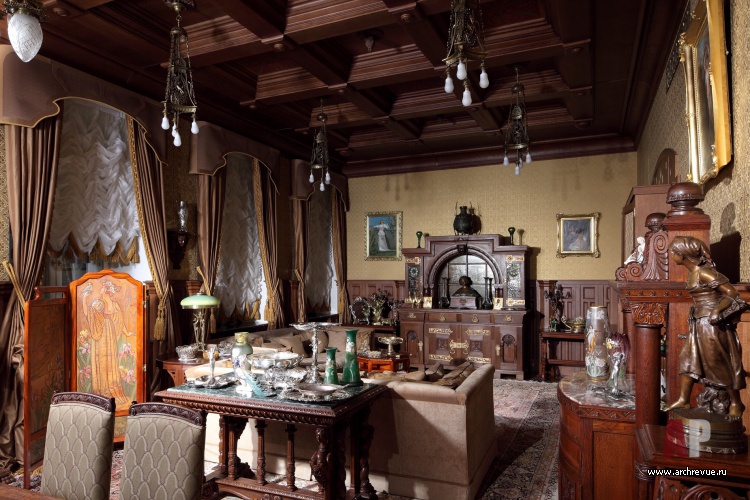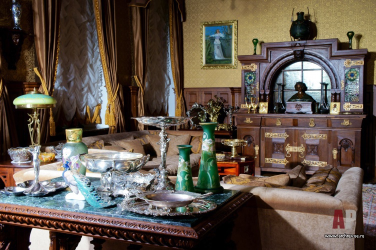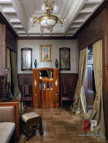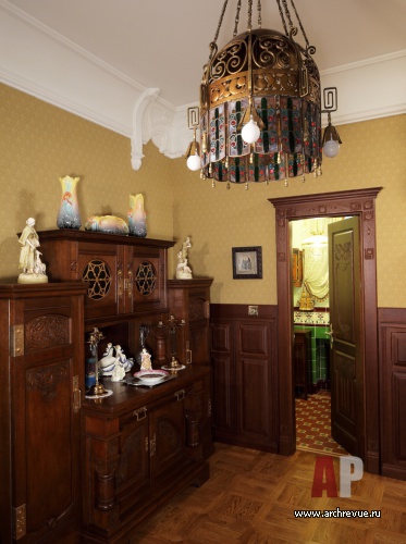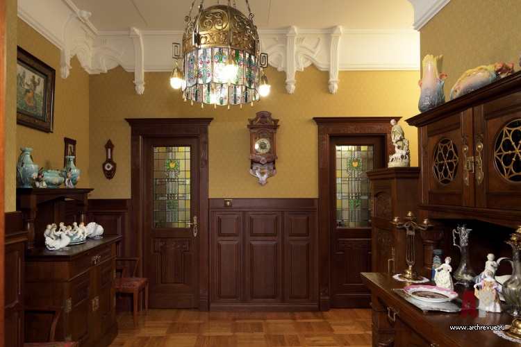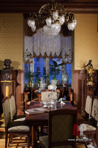 Из всех вариантов стиля модерн предпочтение было отдано русскому модерну с некоторыми приметами югендстиля. Теплая цветовая гамма, большое количество темного дерева, патинированной бронзы и цветной керамики – такой интерьер в пасмурные дни дарит уют домашнего очага и настраивает на лирический лад.