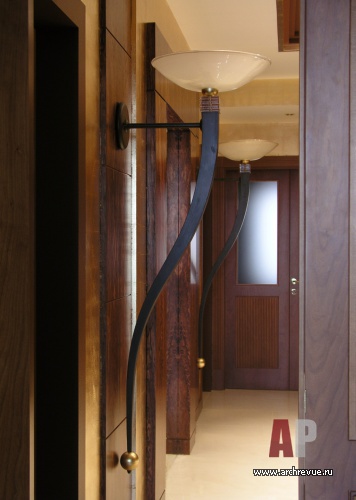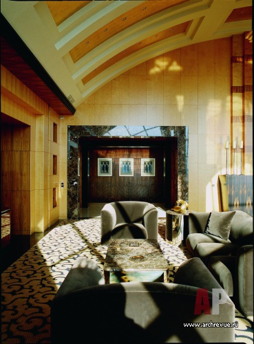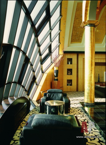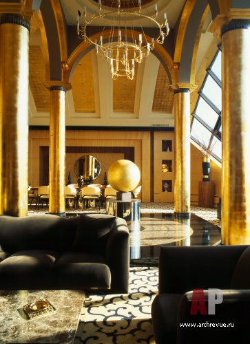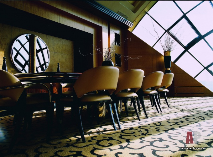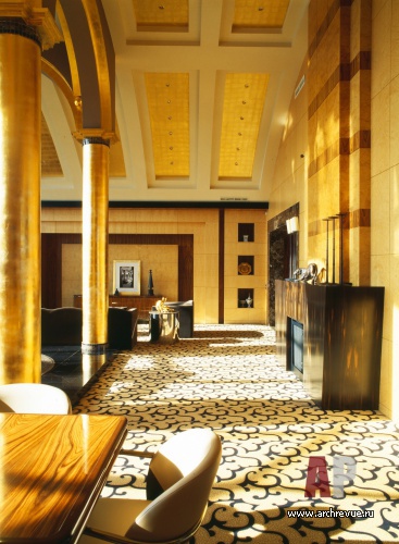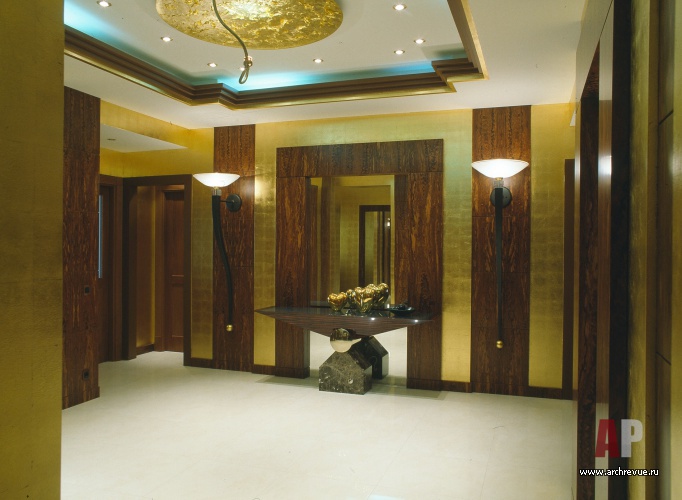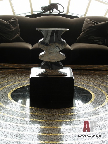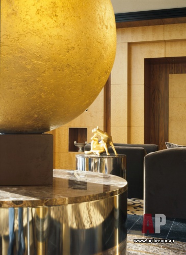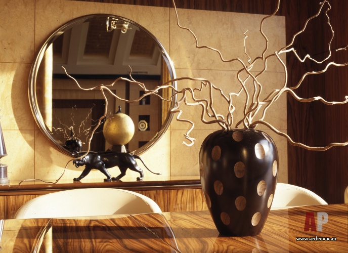 Пентхаус декорирован в стилистке американского ар-деко. В оформлении представительской зоны использованы самые роскошные цвета и фактуры: золото, черный глянец, натуральный камень, микс из редких пород дерева.