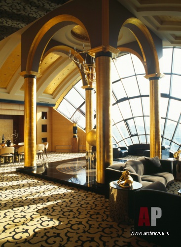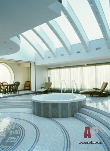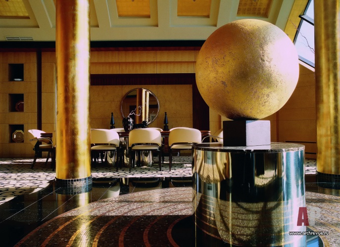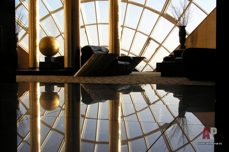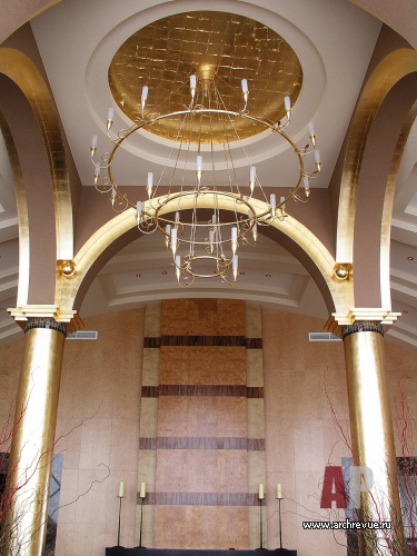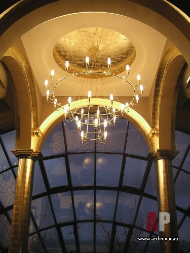 Ситуацию осложняло наличие по центру большого объема несущих колонн. Именно колонны и их соотношение с круглой линией потолка-крыши продиктовали композицию, построенную по классическим законам.