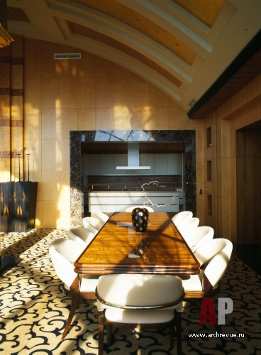 Ядро общей зоны – импровизированная ротонда на гранитном подиуме. Вокруг этого декоративного центра группируются мягкая группа, каминная зона и столовая. В нише расположен небольшой кухонный блок.