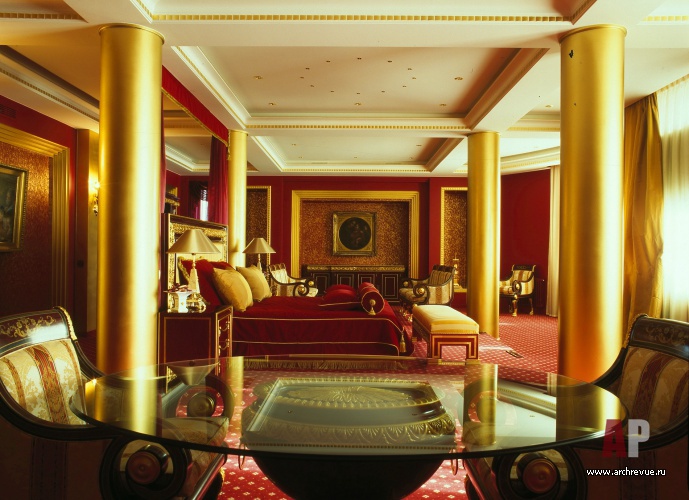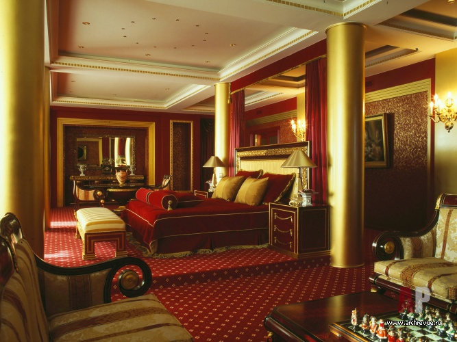 Расположенная уровнем ниже спальня похожа на президентские сьюты в нью-йоркском отеле. Она выполнена в насыщенных красных с золотом тонах с обилием индивидуальных отделок.
