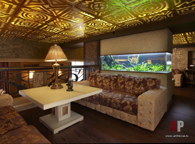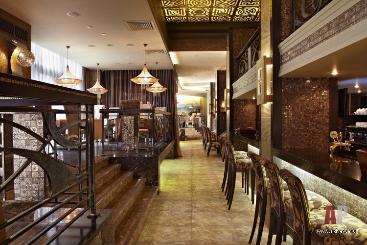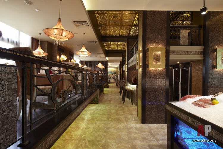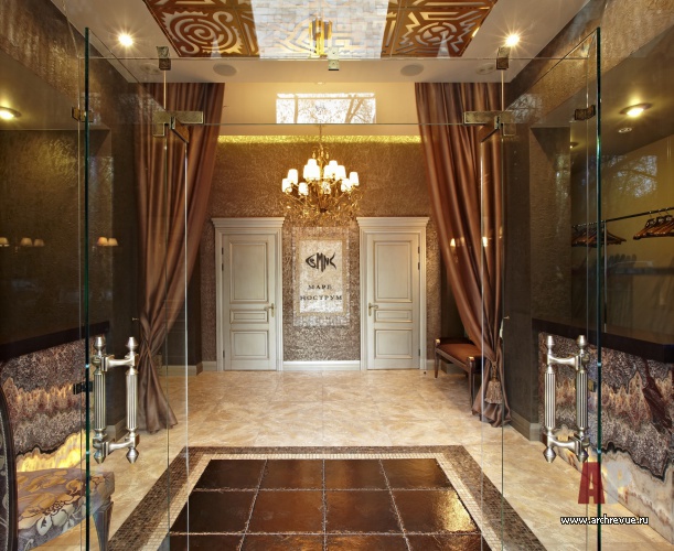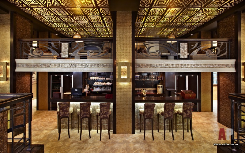Стены покрыты декоративными структурными штукатурками с сусальным золотом, также мраморной и золотой мозаикой. Двери с эмалевым покрытием сочетаются с подсвеченным изнутри натуральным камнем. Прихотливый орнамент патинированного кованого ограждения рифмуется с авангардным потолочным панно.