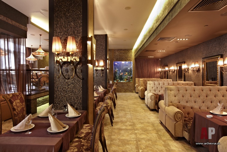 Ресторан средиземноморской кухни Mare Nostrum («Наше море») задумывался как заведение с тотальным авторским дизайном. Все детали его интерьера выполнены по эскизам авторов проекта российскими художниками и мастерами.