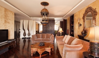 Респектабельный интерьер исполнен в естественных природных бежевых и золотисто-коричневых тонах с яркими акцентами бирюзы. Каждая деталь интерьера выполнена вручную.