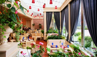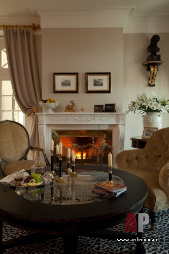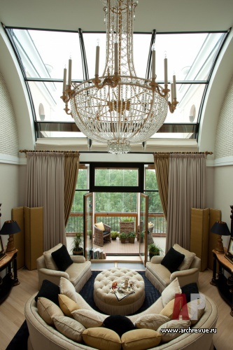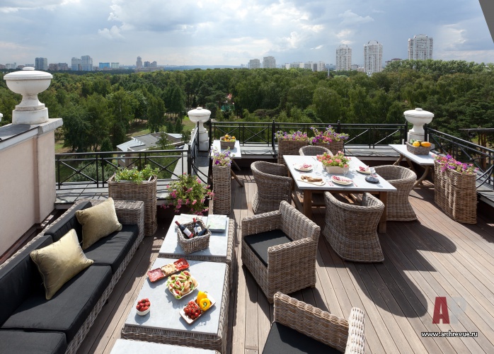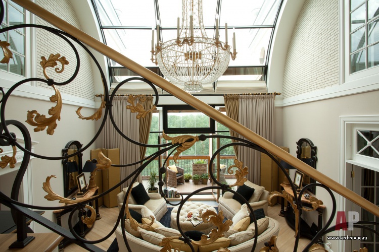 Видовая двухуровневая квартира спроектирована по принципу загородного дома. Здесь есть парадный лестничный холл, зимний сад, два каминных зала, открытая веранда и масса приватных помещений и уголков. Ядро квартиры – двухсветный объем со стеклянным фонарем на крыше, открытым балконом и ажурной лестницей.