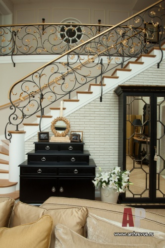 Ключевую роль в облике двухсветной парадной гостиной играют две вещи: кованая конструкция лестницы (она выполнена как два единых шестиметровых полотна) и центральная люстра Mathieu Lustrerie. Заносить в квартиру их пришлось с балкона. Притом из-за того, что дом имеет полукруглую форму и примыкает к парку, мы не могли вызвать подъемный кран, потому пришлось вызывать бригаду альпинистов. 10 человек буквально на руках поднимали и кованую конструкцию, и дорогостоящую уже собранную люстру.