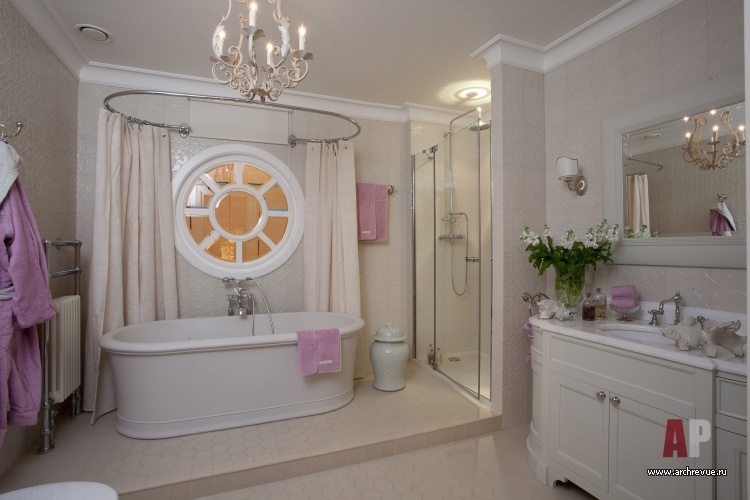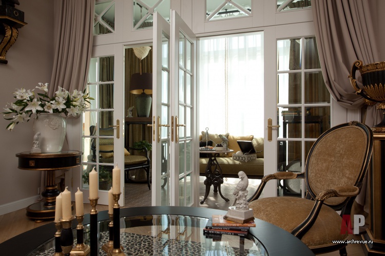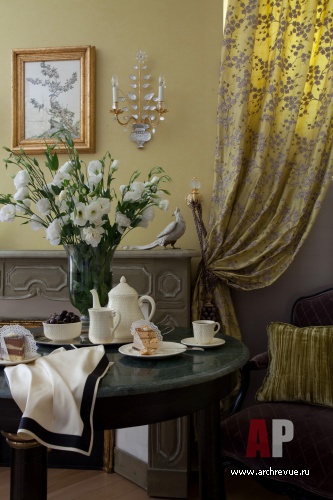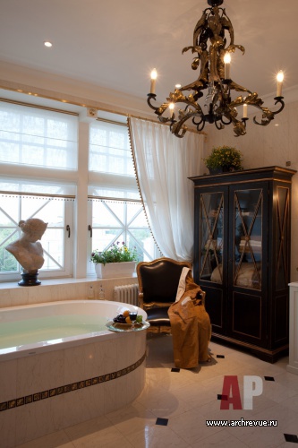 В основных помещениях чувствуется французское влияние: светлая цветовая гамма, французские люстры и светильники в стиле ампир, роскошный текстиль из шелка и шерсти придают помещениям благородный вид.