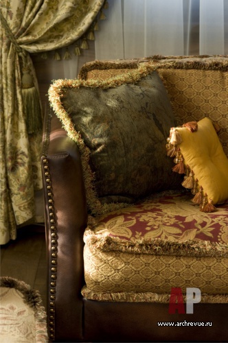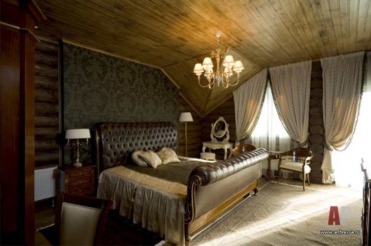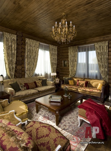 Открытая бревенчатая кладка и дикий камень облицовки камина формируют образ мужского интерьера. Мягкая диванная группа в гостиной выполнена в классическом стиле, что придает интерьеру респектабельный вид.