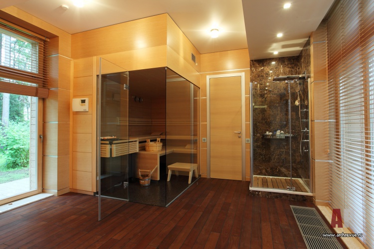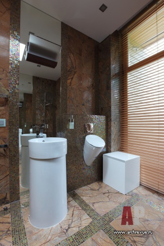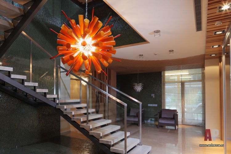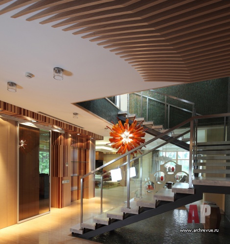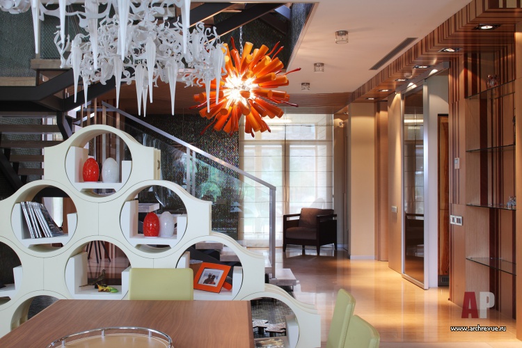 Смысловой и визуальный центр дома – лестничный холл, стены и полы которого облицованы изумрудной мозаикой. Лестница из стекла и металла ведет в приватную часть дома, где есть спальни, детские и зона отдыха в мансарде.