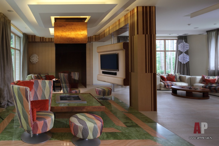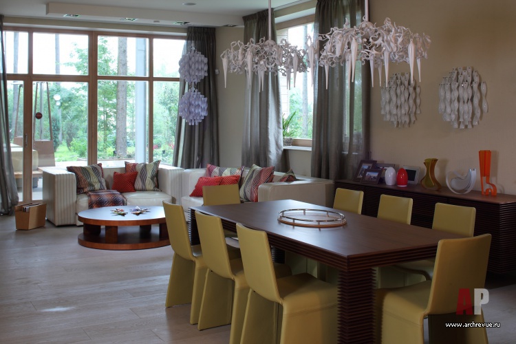 Поэтому перед архитекторами стояла задача создать не просто комфортный интерьер, ориентированный на природу, но сделать его нарядным и эффектным.