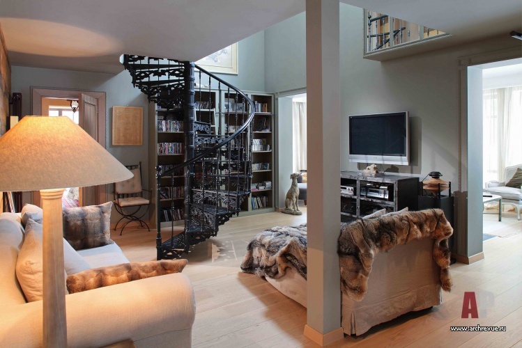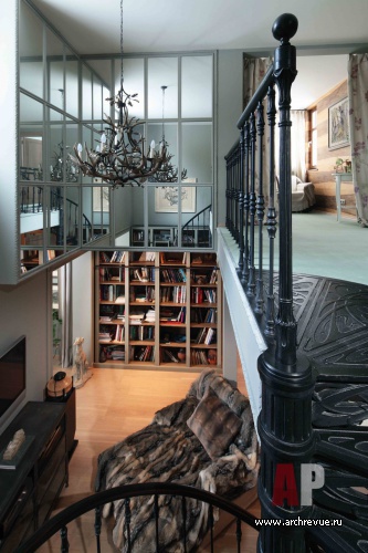 Из гостиной можно перейти в светлую остекленную террасу. На второй этаж, в зону приватных апартаментов ведет чугунная винтовая лестница. Ажурная конструкция выглядит необыкновенно легкой и изящной.