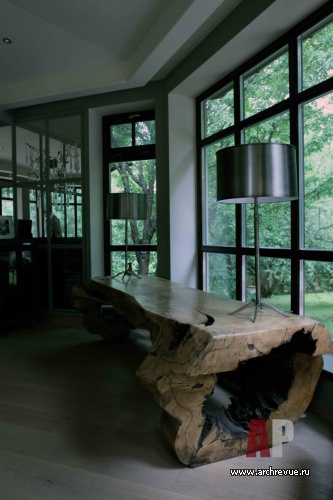 В оформлении интерьеров дома прослеживаются черты традиционной деревянной архитектуры и усадебной классики. В поддержку природной тематики стены зашиты массивными панелями из продольного спила разных сортов дерева.