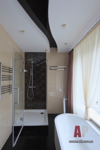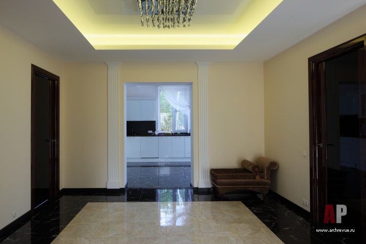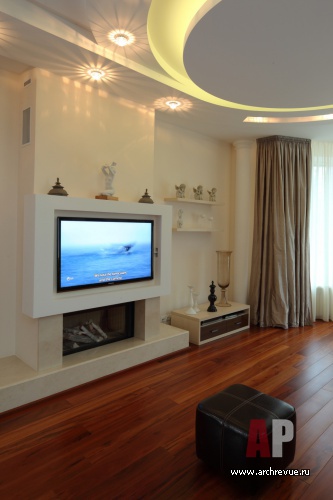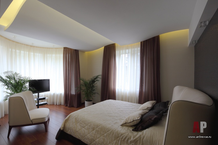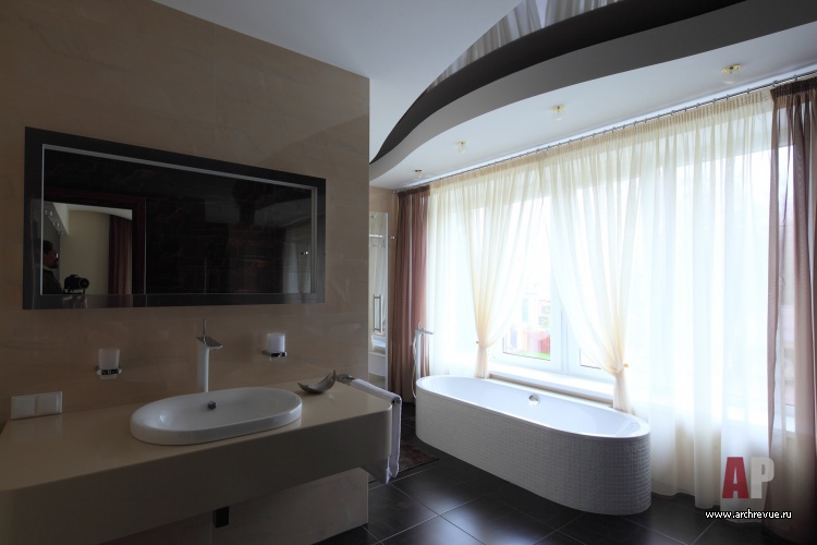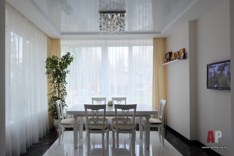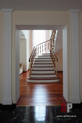 На первом этаже – гостиная с высокими окнами, кабинет, просторный холл и светлая кухня-столовая. На втором этаже располагаются спальни и детские комнаты. Мансарда отдана под домашний кинотеатр. Гостиная с вписанным полукруглым эркером имеет мягкие формы. Эту геометрическую округлость подчеркивает многоуровневый потолок в виде спирали.