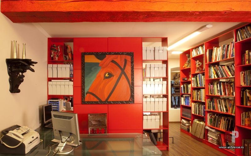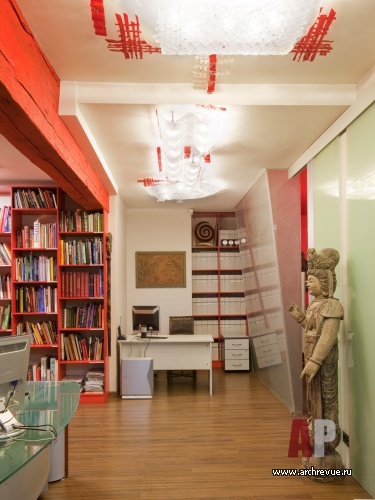 Декоративные акценты офисного интерьера – исторические деревянные потолочные балки. Они выкрашены в красный цвет и задают пространству ритм.