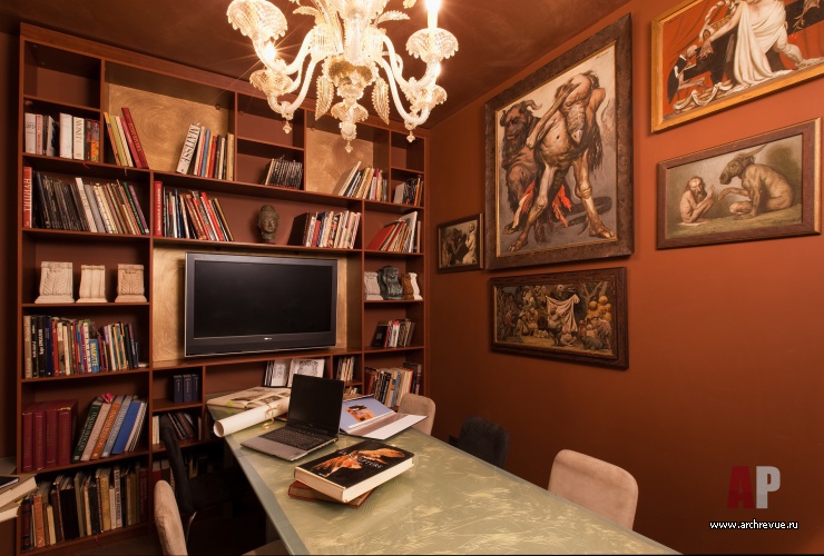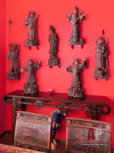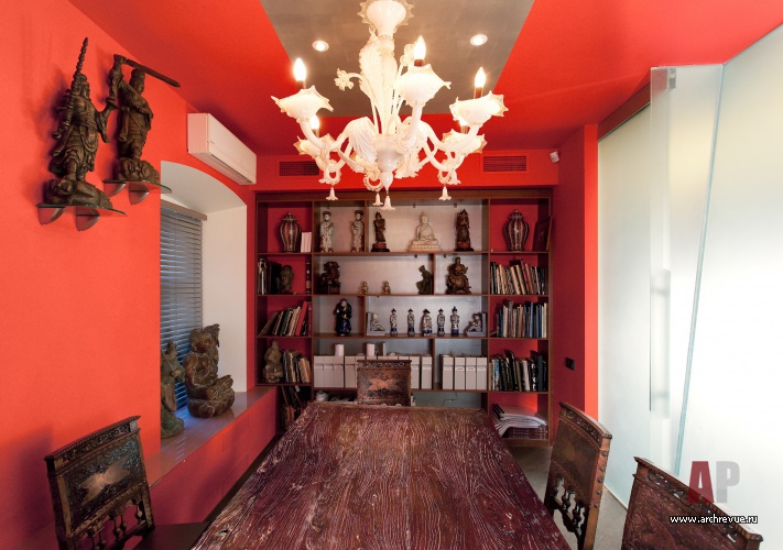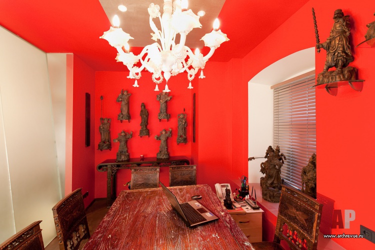 Переговорные отделены наклонными стеклянными панелями, которые зрительно раскрывают пространство. «Падающая» стена хорошо читается от входа и вносит в помещение жесткую конструктивистскую динамику. Авангардное звучание интерьерам также придает авторский потолочный светильник и фрагмент копии полотна Петрова-Водкина «Купание красного коня».