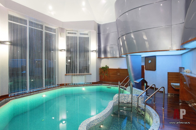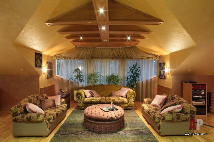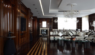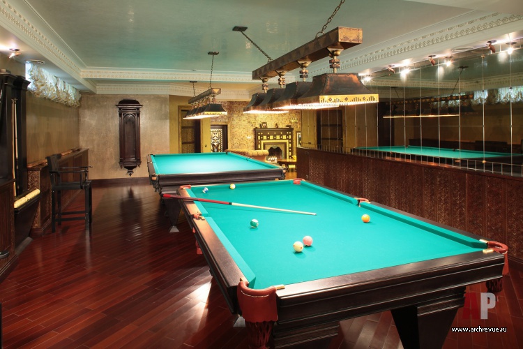 Планировка четырехэтажного дома строится по классической схеме. В цокольном этаже расположены бассейн, бильярдная, каминная в восточном стиле и винный погреб. Первый уровень занимает большая гостиная – свободное пространство, наполненное светом и воздухом.