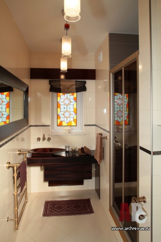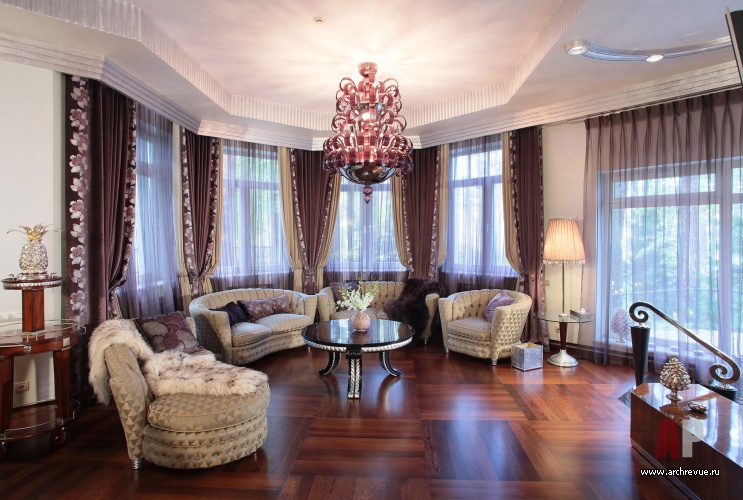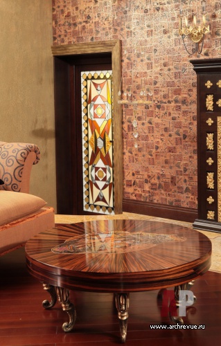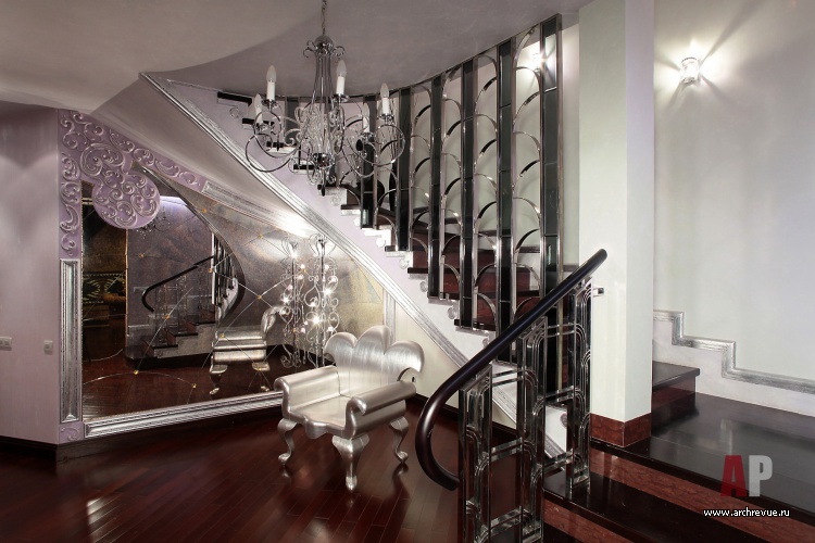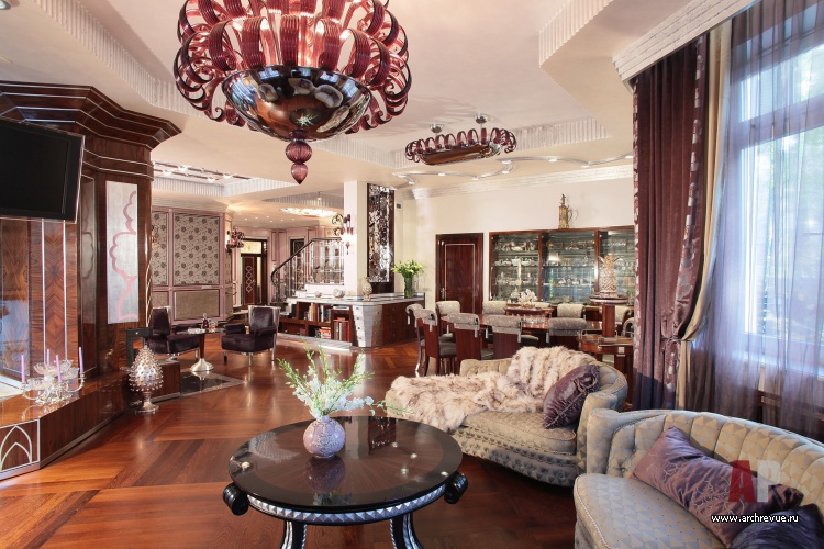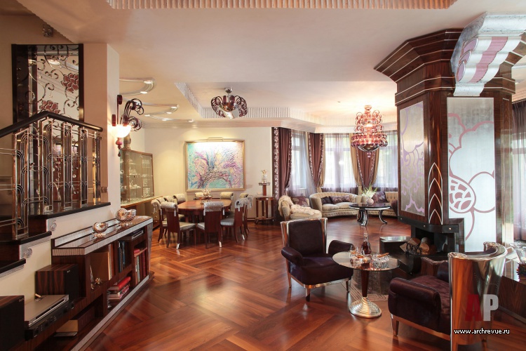 Интерьеры дома в стиле ар-деко полны эксклюзивных, разработанных специально под них декоративных решений. Отделочные материалы были выбраны традиционные – дерево, металл, стекло, камень (в том числе и полудрагоценные родонит, оникс и яшма).