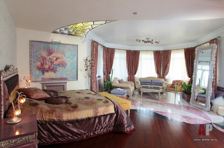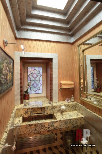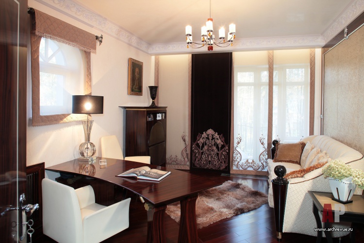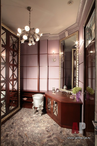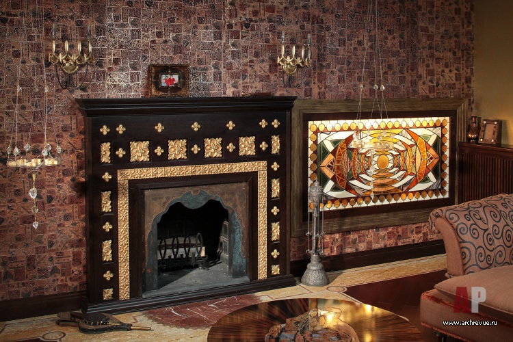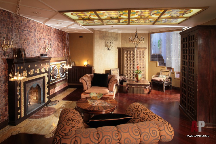 Но в процессе художественно-отделочных работ стало понятно, что заказчикам ближе стиль ар-деко. В итоге родился декоративный микс из элементов двух роскошных стилей начала ХХ века. В цокольном этаже он дополнен роскошными восточными мотивами.