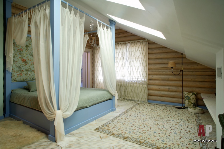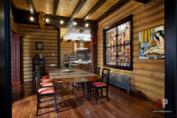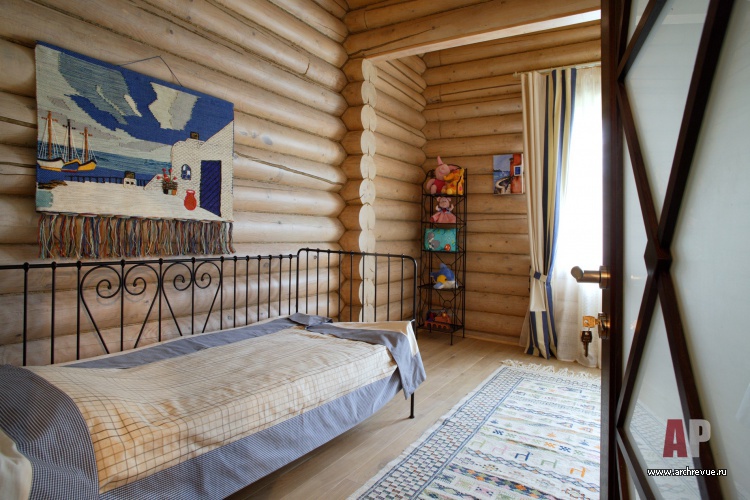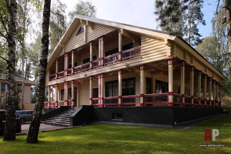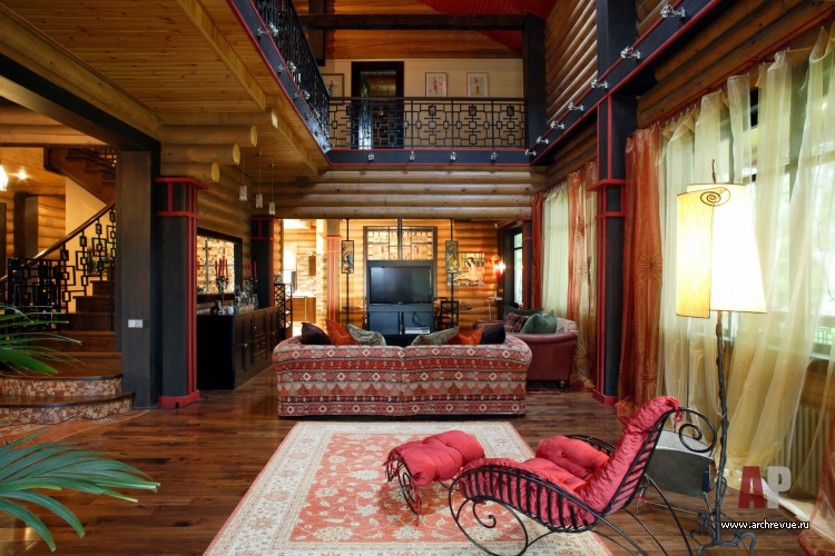 Дизайн дома из оцилиндрованного соснового бревна выполнен в современном стиле с яркими цветовыми акцентами.