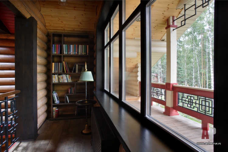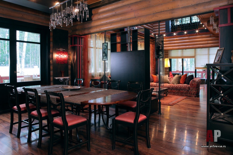 Особенность трехэтажного деревянного дома с опоясывающей террасой – общая гостевая зона. Использование оцилиндрованного бревна в качестве строительного материала диктовало определенные условия планировки, несмотря на это первый этаж, традиционно отведенный под парадную зону, удалось практически полностью объединить.