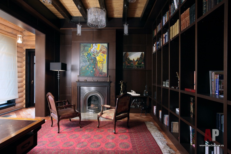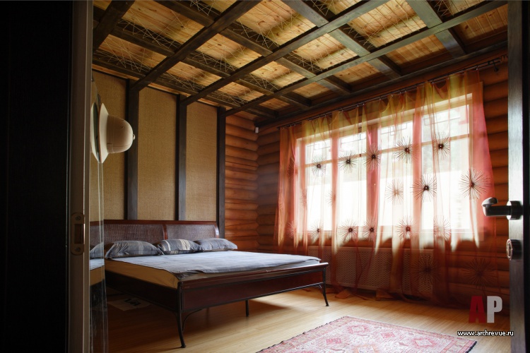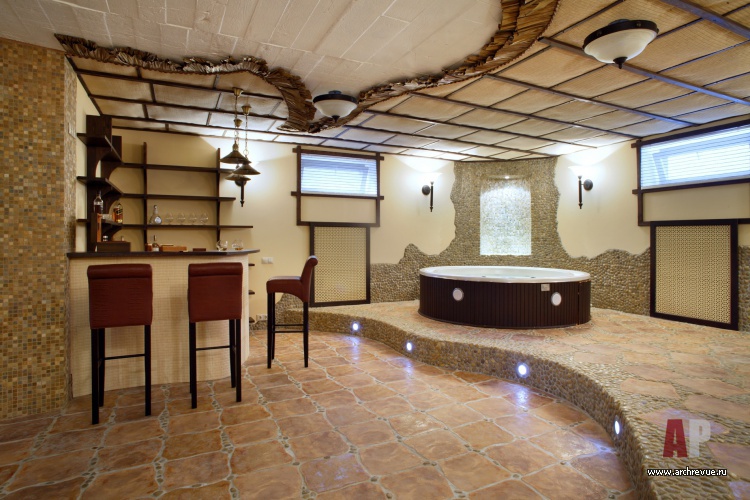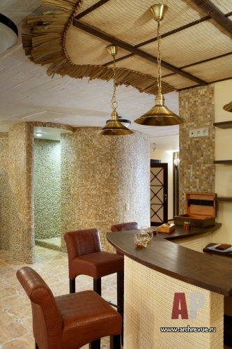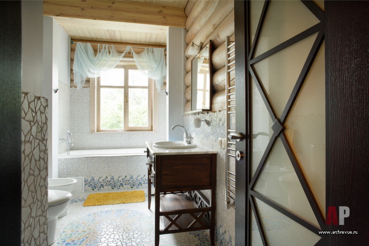 Бревенчатая кладка оттонирована в глубокий шоколадный оттенок и поддержана пестрой массивной доской из древесины ореха. Мокрые зоны декорированы плиткой в стиле средиземноморских интерьеров и яркой керамической мозаикой.