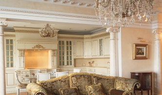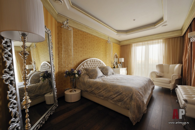 Образ самого дорого и изящного стиля поддерживают характерные отделки: наборный паркет со сложным рисунком, зеркальное панно, составленное из небольших модулей, обилие золотых деталей и глянцевые поверхности.