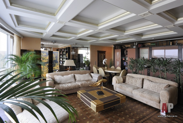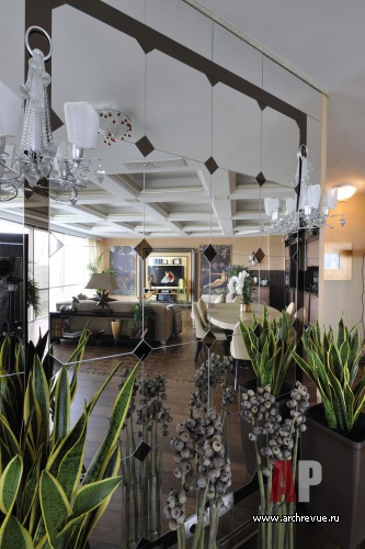 По количеству живых растений интерьер напоминает зимний сад. Тропические цветы украшают даже ванную комнату. В гостиной и холле внимание привлекают панно с копиями работ музейного уровня живописцев конца XIX – начала XX веков. Выполненные методом плоттерной печати они создают убедительную декорацию для жизни в стиле ар-деко.