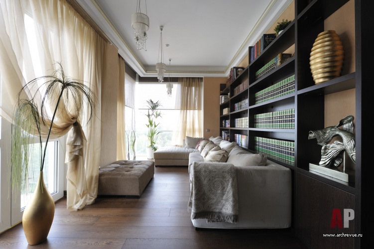 Общественная часть решена по принципу студии: гостиная, столовая и кухня объединены в общее пространство, которое через широкий портал перетекает в зону отдыха с библиотечными стеллажами и уютными диванами.