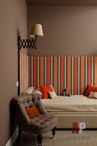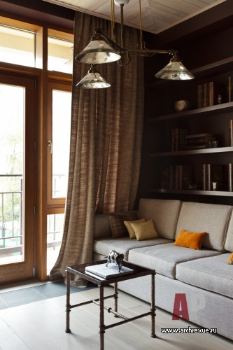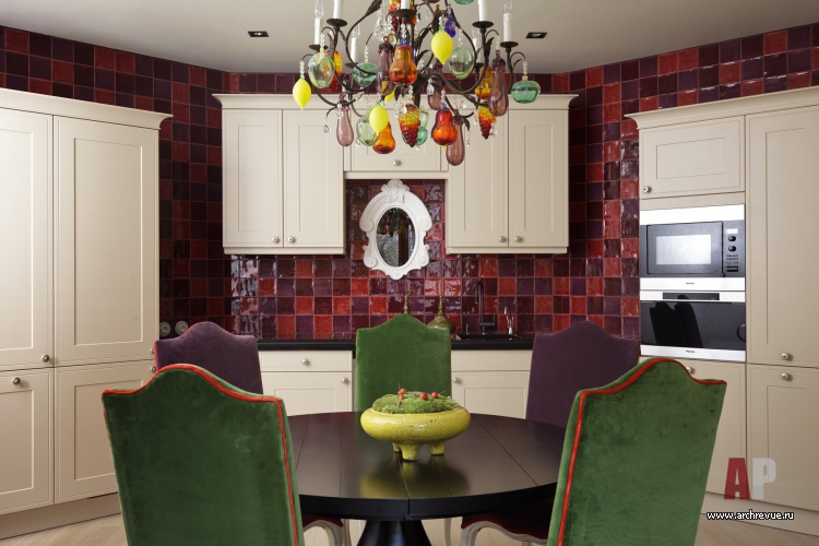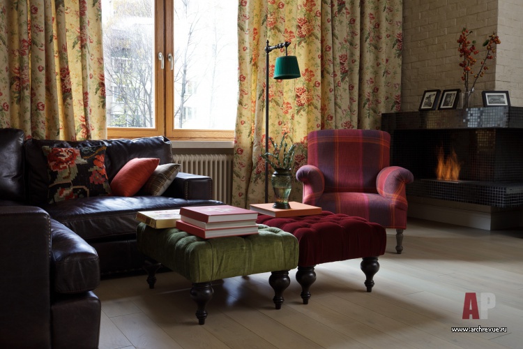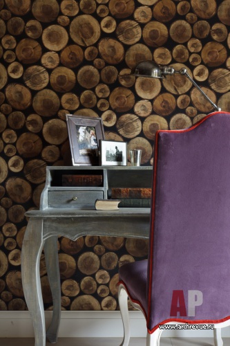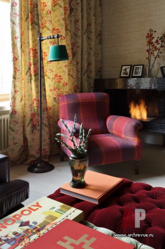 Декораторы сделали ставку на яркие цвета теплые фактуры и приметы загородной жизни. Например, стена в кабинете оклеена обоями с имитацией поленницы, кресла в гостиной обиты тканью «в клетку», а кухонный фартук облицован яркой брусничной плиткой.