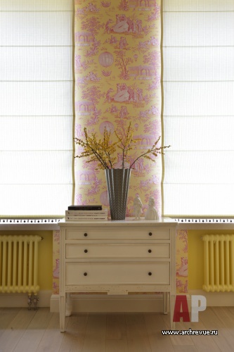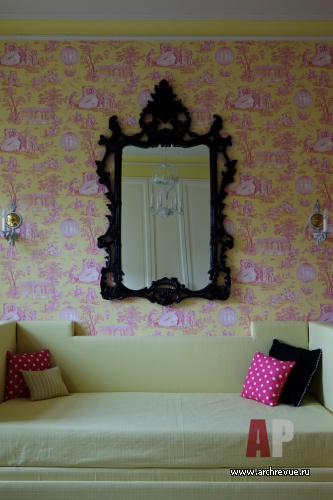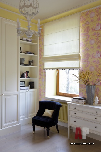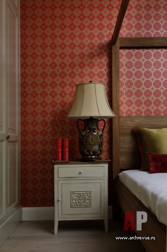 Подушки с вышивкой «крестиком», шторы в цветочек и дощатые полы усиливают ощущение жизни за пределами мегаполиса. Интерьер решен широкими мазками и выглядит ярким и праздничным. Во многом благодаря тому, что авторы во всех помещениях использовали обои насыщенных цветов со сложным рисунком.
