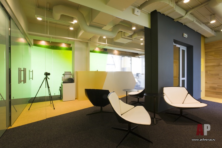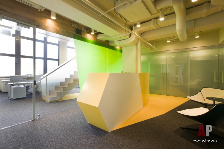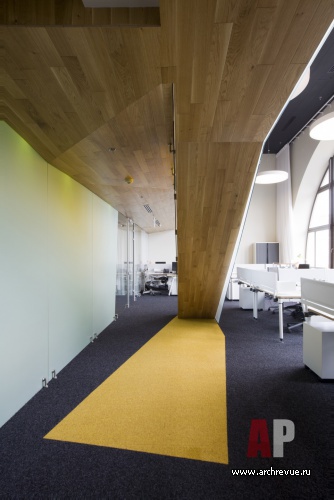 В отделке офиса применялись экологичные материалы: натуральное дерево, стекло, пробка. Ковролин контрастных цветов использован не только на полу, но и на потолке, что создает оригинальную и уютную обстановку.