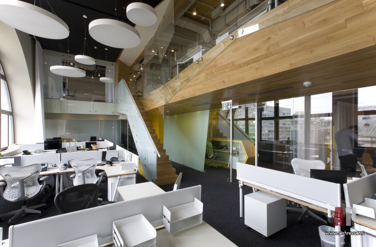 Двухуровневый офис компании «Яндекс» расположен на 6 и 7 этажах бизнес-центра «Леонардо» в Киеве. В отличие от других региональных офисов крупнейшей в Росси IT-компании он совсем небольшой: занимает 290 кв. м и рассчитан на 34 сотрудника.