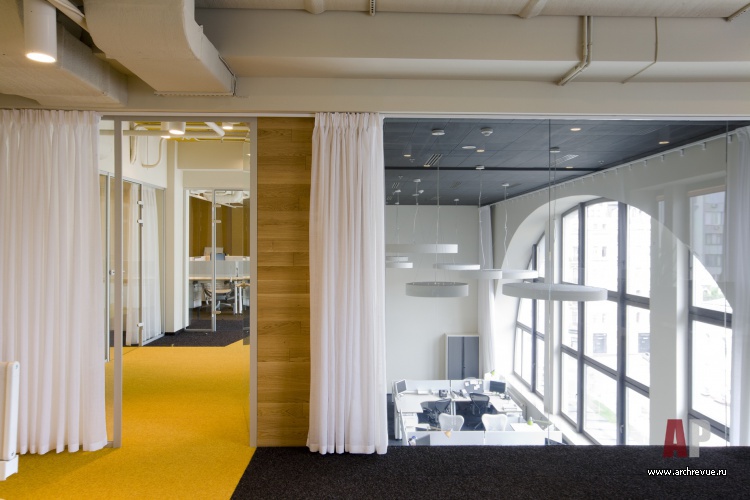 Особенность архитектуры офисного центра – огромное арочное окно, из которого открывается замечательный вид на оперный театр и площадь перед ней. Именно оно подтолкнуло нас к идее развесить на потолке огромные лампы-барабаны Xal.