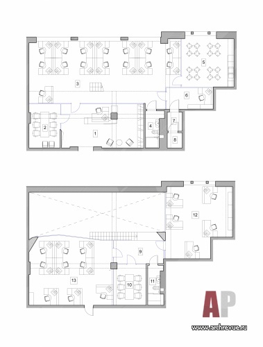Рабочее пространство этажей решено по принципу open-space. Нижний этаж выполняет функцию клиентской зоны, на верхнем сгруппированы служебные зоны. Переговорные расположены на обоих этажах и различаются по назначению: нижняя – для приема клиентов, верхняя – для оперативных собраний сотрудников.