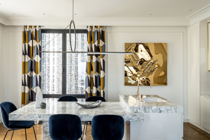 «Увидев, какой фантастический вид открывается из окна, мы с заказчиками приняли решение развернуть гостиную «лицом к окнам». Полностью «перевернуть» предложенную застройщиком стандартную планировку», - отмечает Валерия Маслова. Этот прием сделал современную городскую панораму значимой частью интерьерного ландшафта, внес в пространство урбанистический дух, который авторы обыграли с помощью культовых дизайнерских предметов, сложной ритмики отделки и искусства.