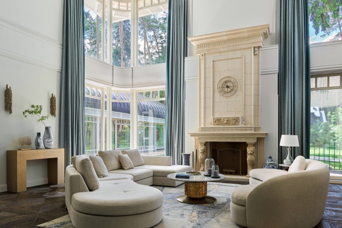 «Я не присутствовала на первой встрече, мне передали только запись разговора, - рассказывает архитектор. – В ней заказчица озвучила основные пожелания: связь интерьера с экстерьером, индивидуальная вневременная стилистка с отсылками к ар-деко, авторские, но без экстравагантности решения, нейтральная цветовая палитра с нюансной деталировкой и каменный пол в помещениях первого этажа. Сначала меня смущал камень, так как почти любой мрамор имеет активный рисунок и берет на себя много внимания. Но мне удалось найти идеальный вариант – юрский мрамор, у него абсолютно нейтральный цвет и сложная текстура с включением окаменелостей». В итоге именно камень задал основную линию: мягкие бежево-песочные оттенки и тактильные фактуры объединили весь интерьер. Благодаря такому решению все 1300 кв. м воспринимаются как единое цельное пространство, очень комфортное для проживания. Нейтральный цвет хорошо подчеркивает архитектуру и пластику стен и оттеняет цветовые акценты, раритетный винтаж и искусство.