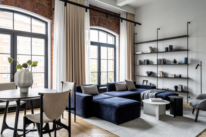 Квартира расположена в малоэтажном доме в историческом районе на севере Санкт-Петербурга. Из ее окон открывается вид на парк с прудом и внутренний двор с яблонями и елками. Сам дом не новый, он был построен в начале 2000-х годов и стилизован под готический замок со стрельчатым фасадом и камином в каждой квартире. Поэтому авторам проекта досталось атмосферное пространство с кирпичными стенами, высокими потолками, деревянными окнами в пол и действующим камином.