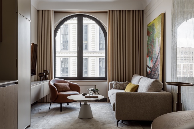Особенность фасадов здания – исторические архитектурные приемы: арочные окна, крупный руст и «алмазная огранка» декоративных деталей. Именно они вдохновили автора на создание интерьера с необычной пластикой, деликатными рельефными орнаментами и элементами неоклассики.