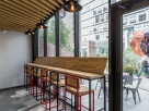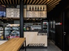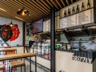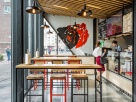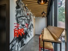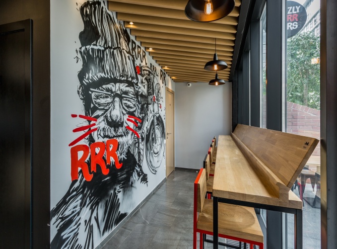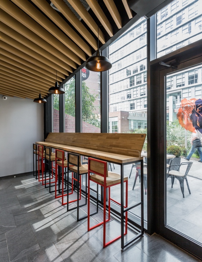 Стены оформлены граффити, потолок подшит деревянными рейками, барная зоны выстроена из фанеры, барные столы и стулья сделаны по проекту дизайнеров. В итоге получилось удобное место для быстрого перекуса во время ланча и покупки горячих бургеров на вынос.
