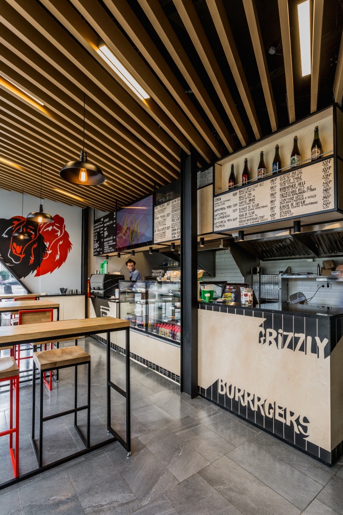 Фото интерьера бургерной Grizzly Burrrgers. Автор проекта здания и интерьера: архитектурное бюро IND Architects.