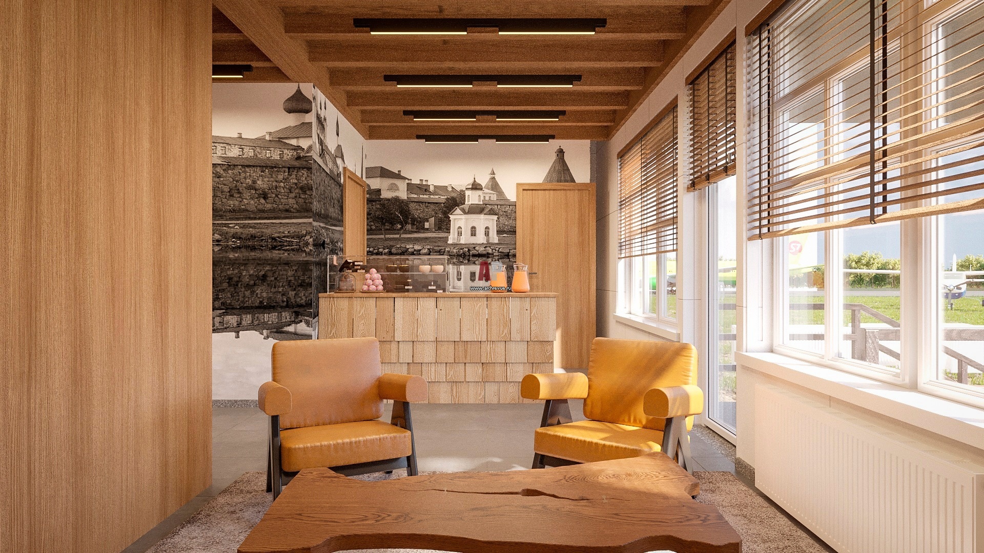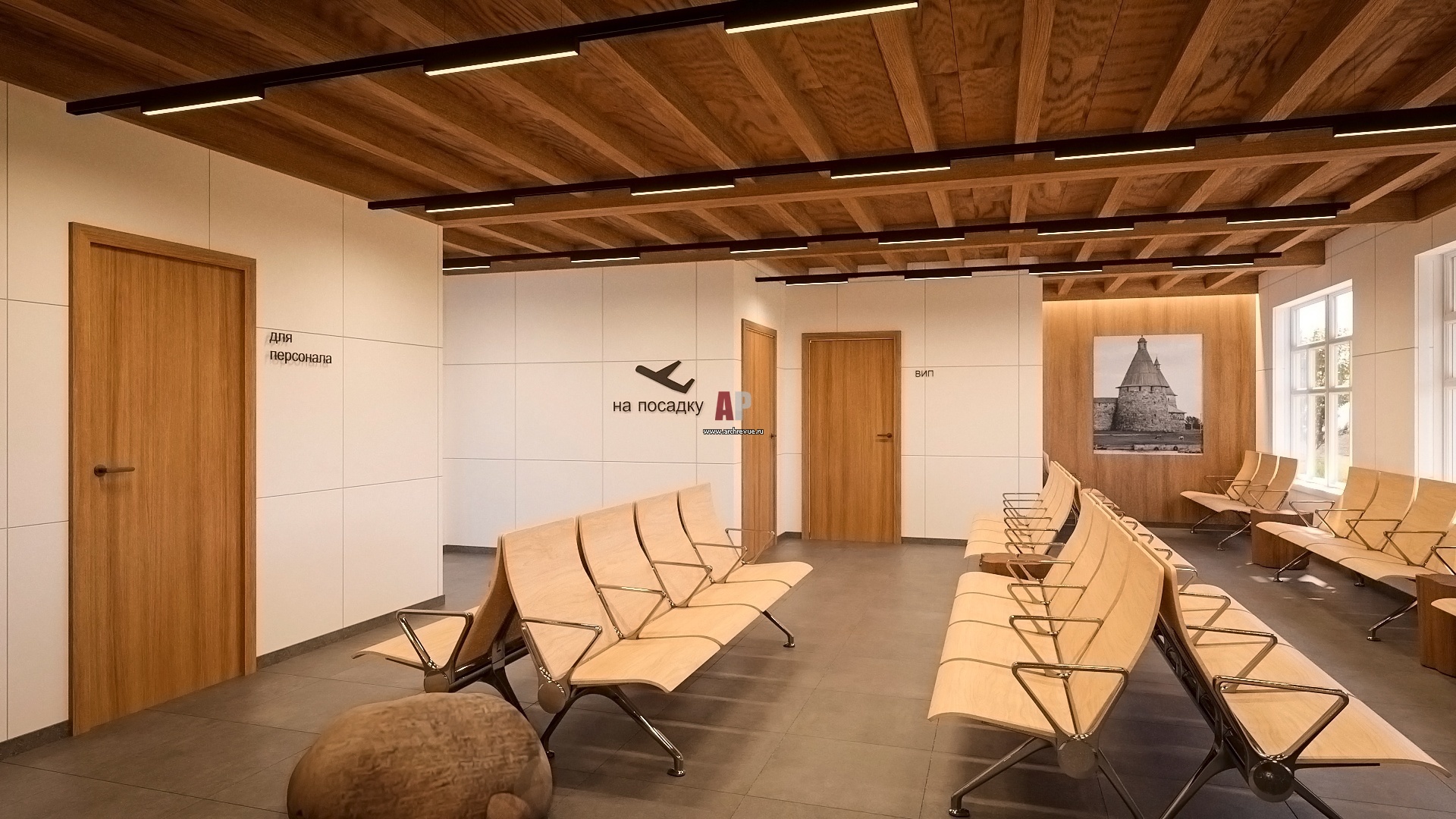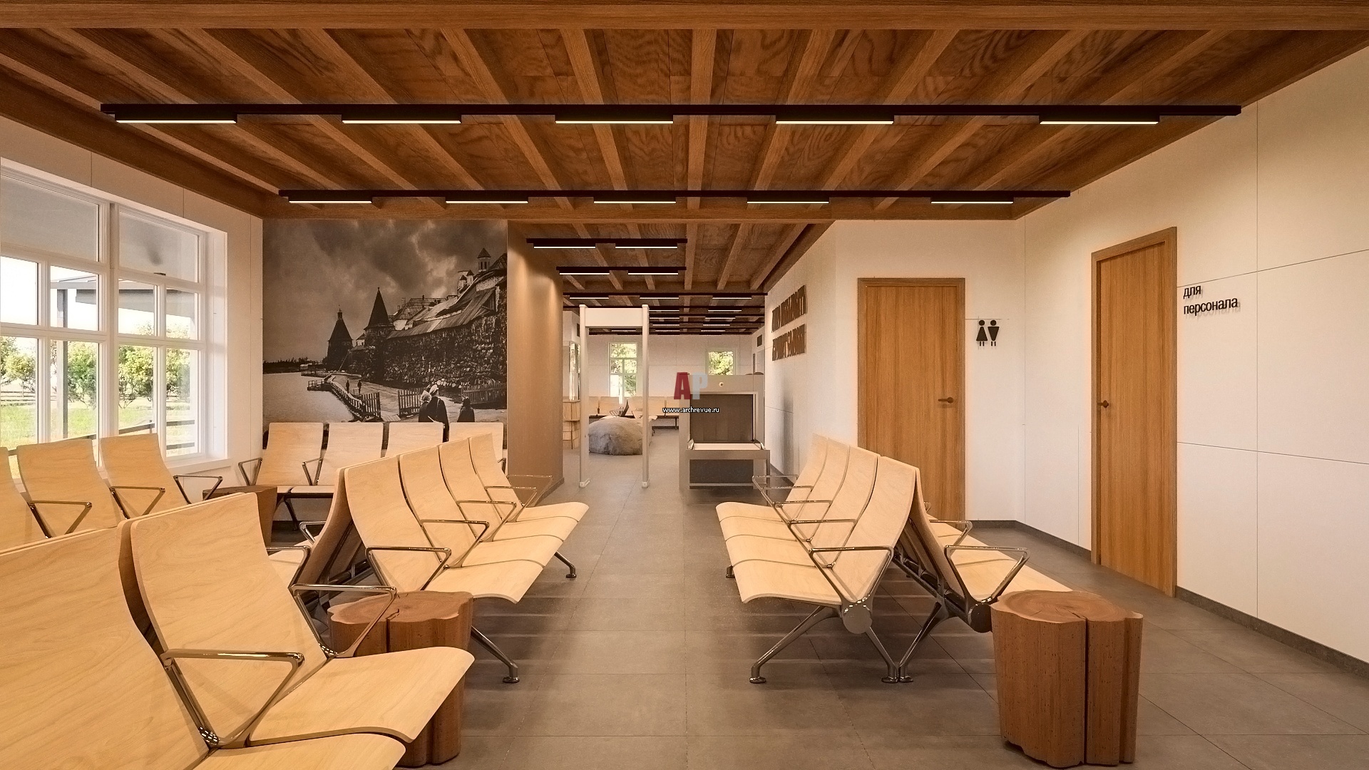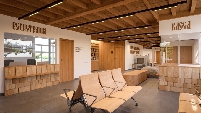 Стены, потолки, двери, стойки и кресла в зале ожидания будут отделаны светлым деревом – это визуально расширяет пространство. Дух Русского Севера воплощен в деталях и отделке: фрагменты резьбы с традиционными орнаментами, каменные валуны, фрагменты бревен, спилы деревьев и масштабное панно из гипса, на котором изображена стихия Белого моря. И конечно, крупные постеры с изображениями жемчужины этих мест – Соловецкого монастыря и величественных видов, которые открываются на знаменитое Святое озеро.
