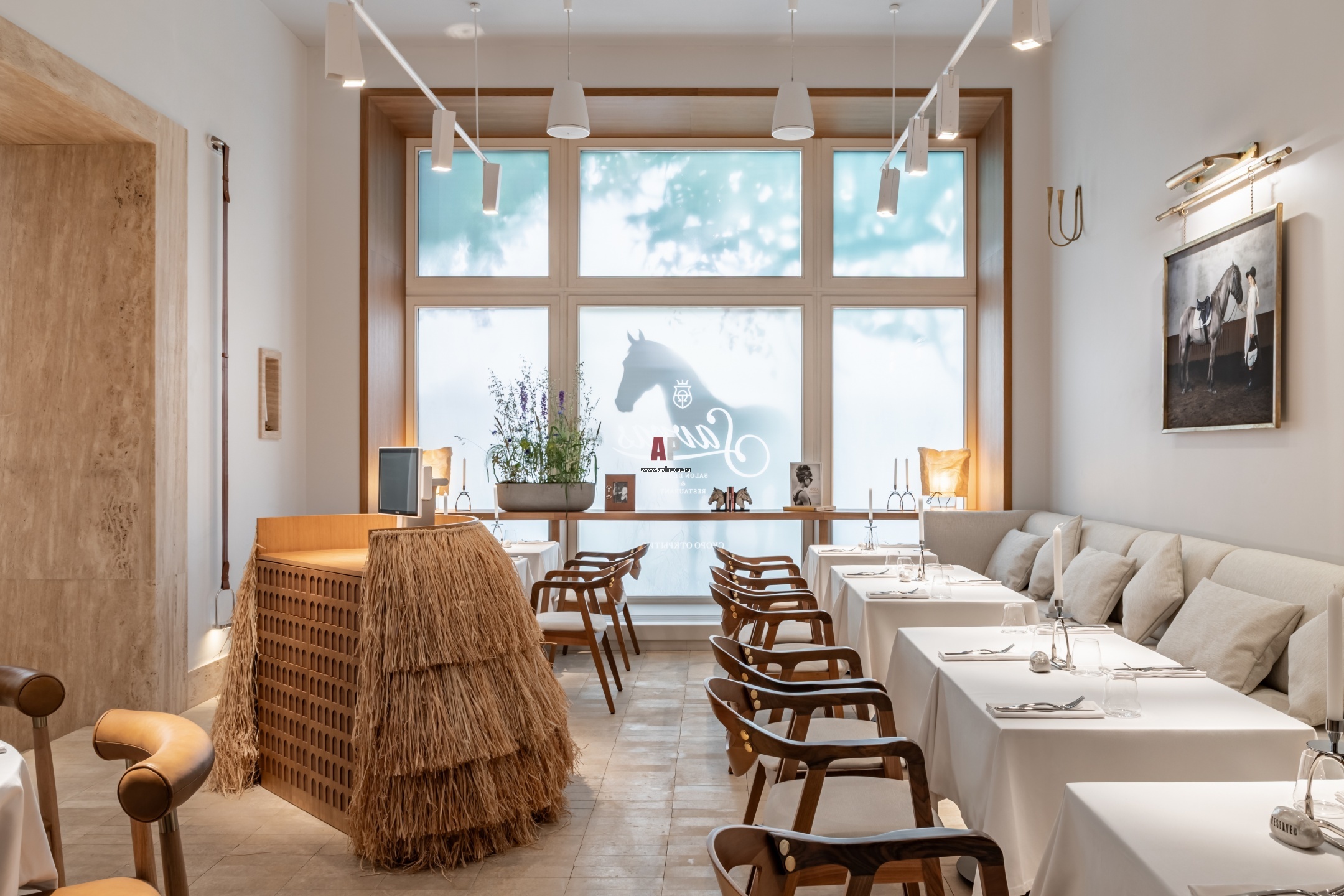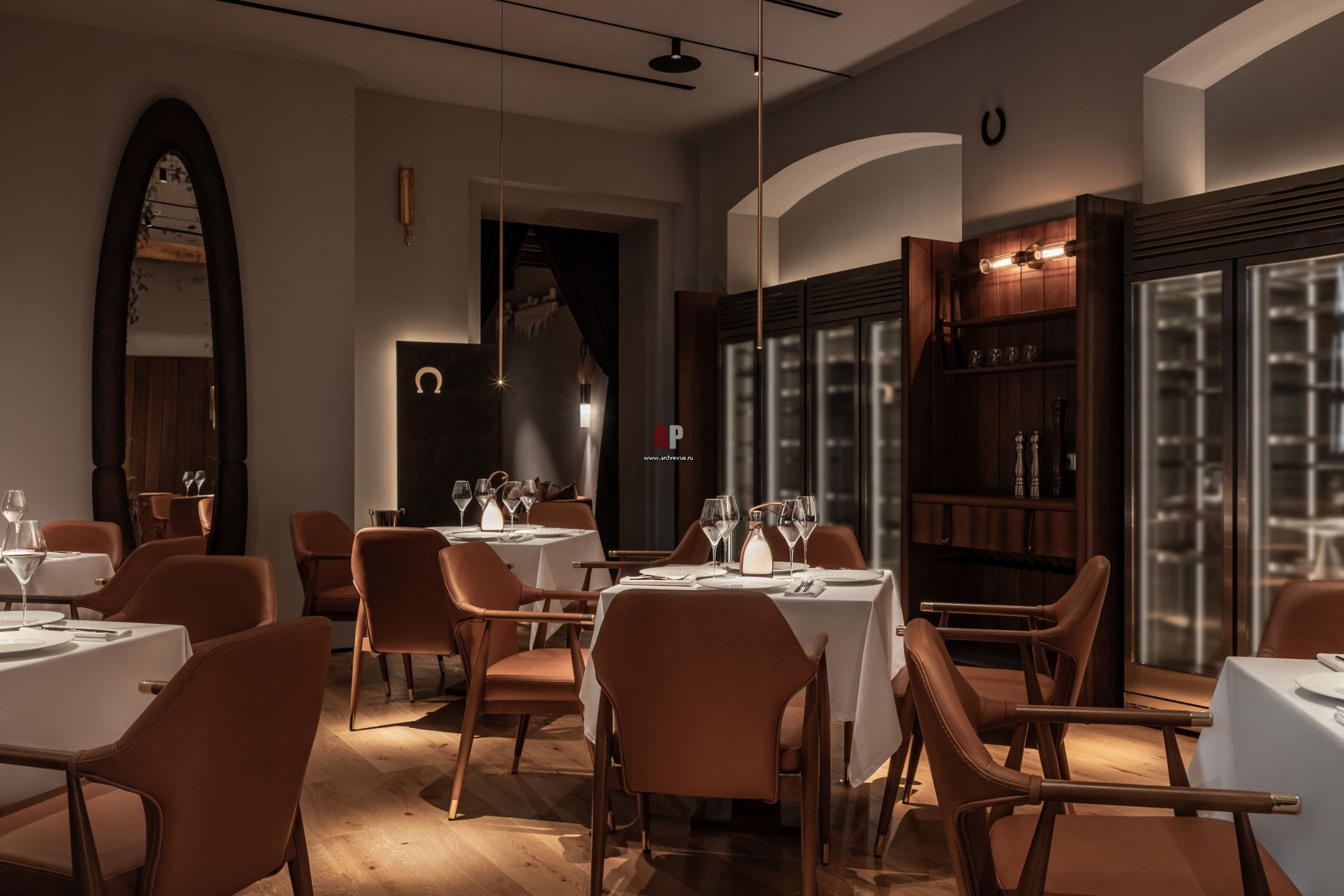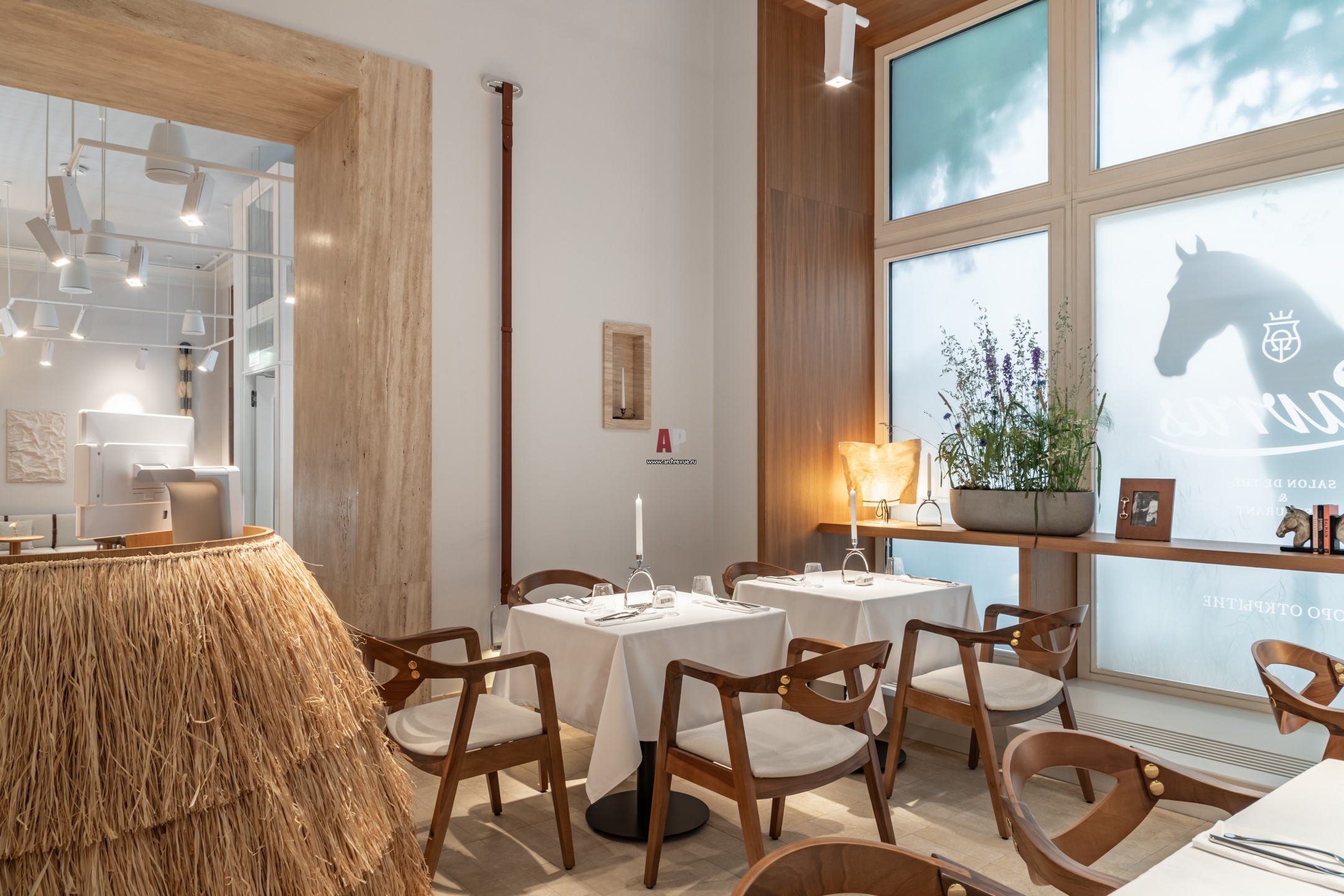 Небольшой по площади ресторан состоит из четырех залов. В первом, оформленном в стиле французского городского кафе, расположились кондитерская-«библиотека», где «сладкий» цех вынесен в зал, и brasserie. За кондитерской расположен обеденный зал, интерьер которого ненавязчиво подводит к теме старинной конюшни, раскрывающейся в двух дальних залах.