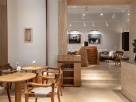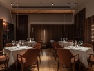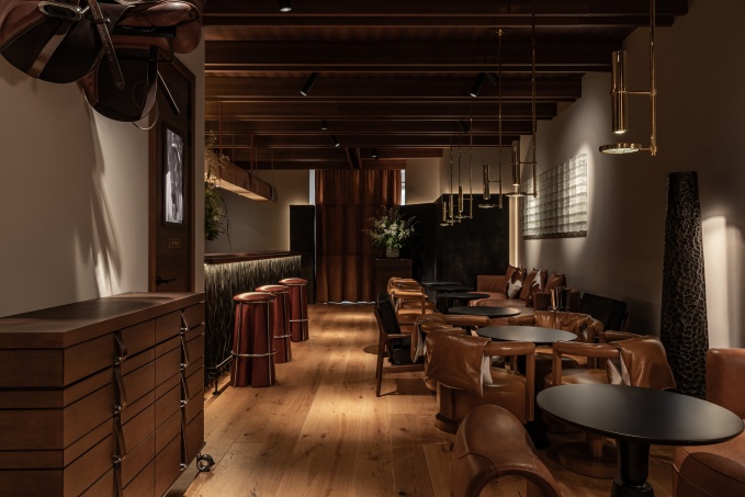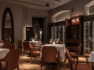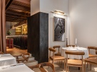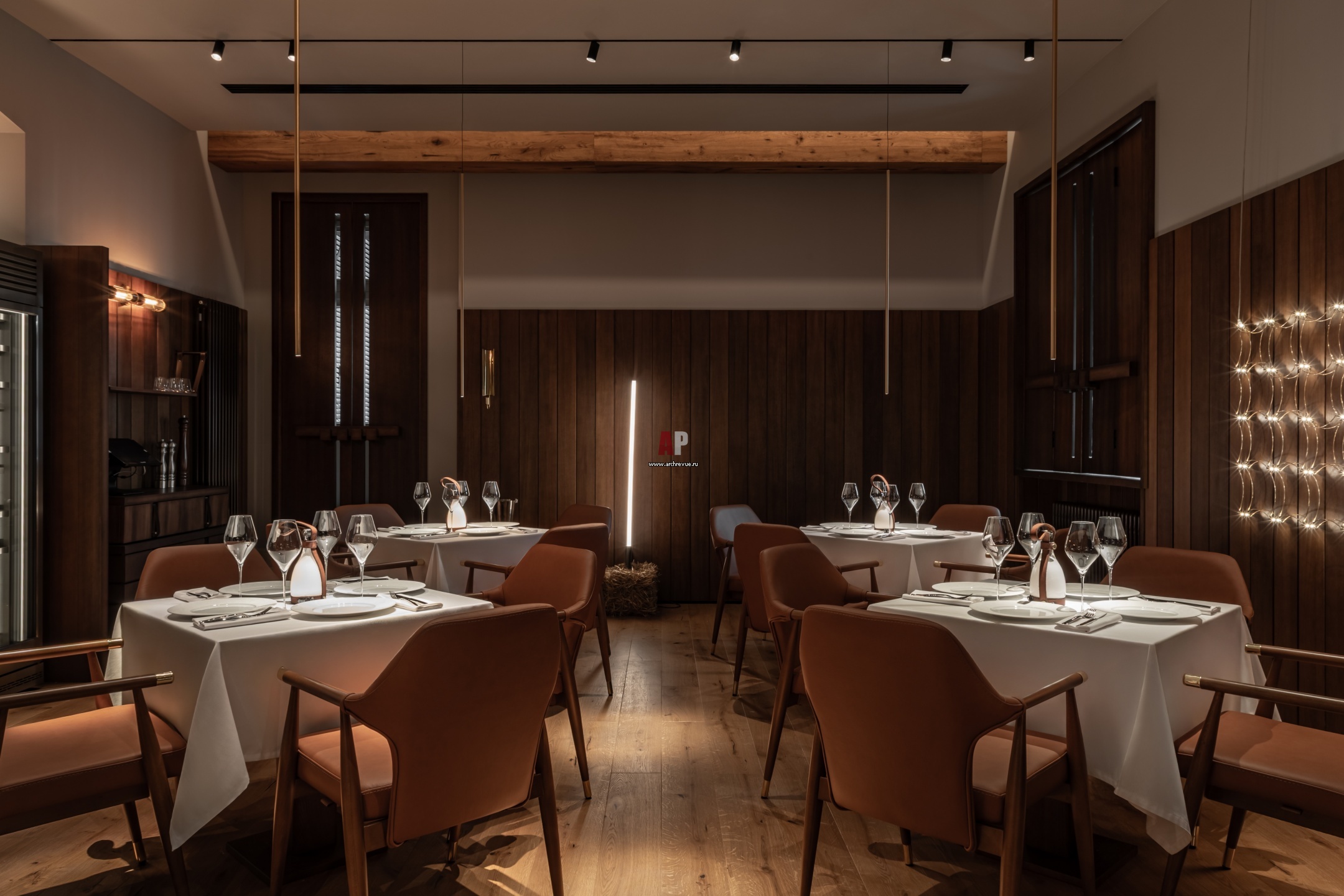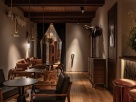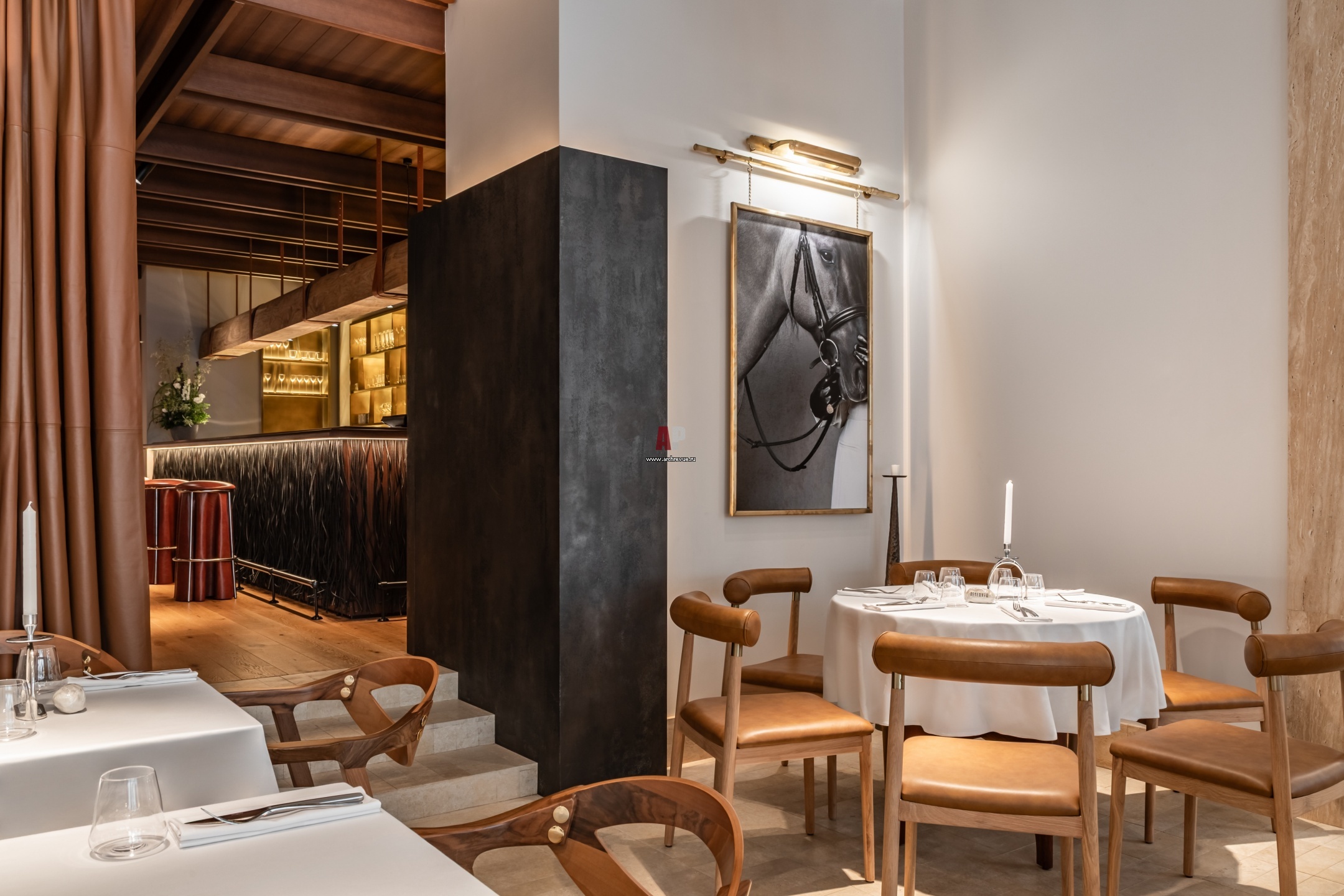 Небольшой по площади ресторан состоит из четырех залов. В первом, оформленном в стиле французского городского кафе, расположились кондитерская-«библиотека», где «сладкий» цех вынесен в зал, и brasserie. За кондитерской расположен обеденный зал, интерьер которого ненавязчиво подводит к теме старинной конюшни, раскрывающейся в двух дальних залах.